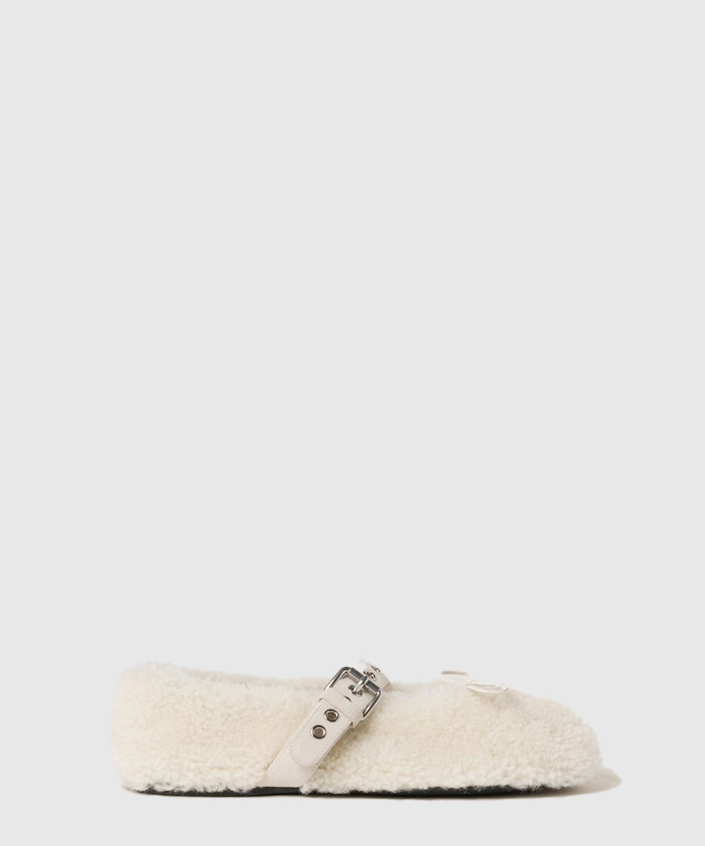 미우미우 시어링 퍼 버클 스트랩 발레리나 슈즈 내추럴 5F272E > [플랫슈즈]