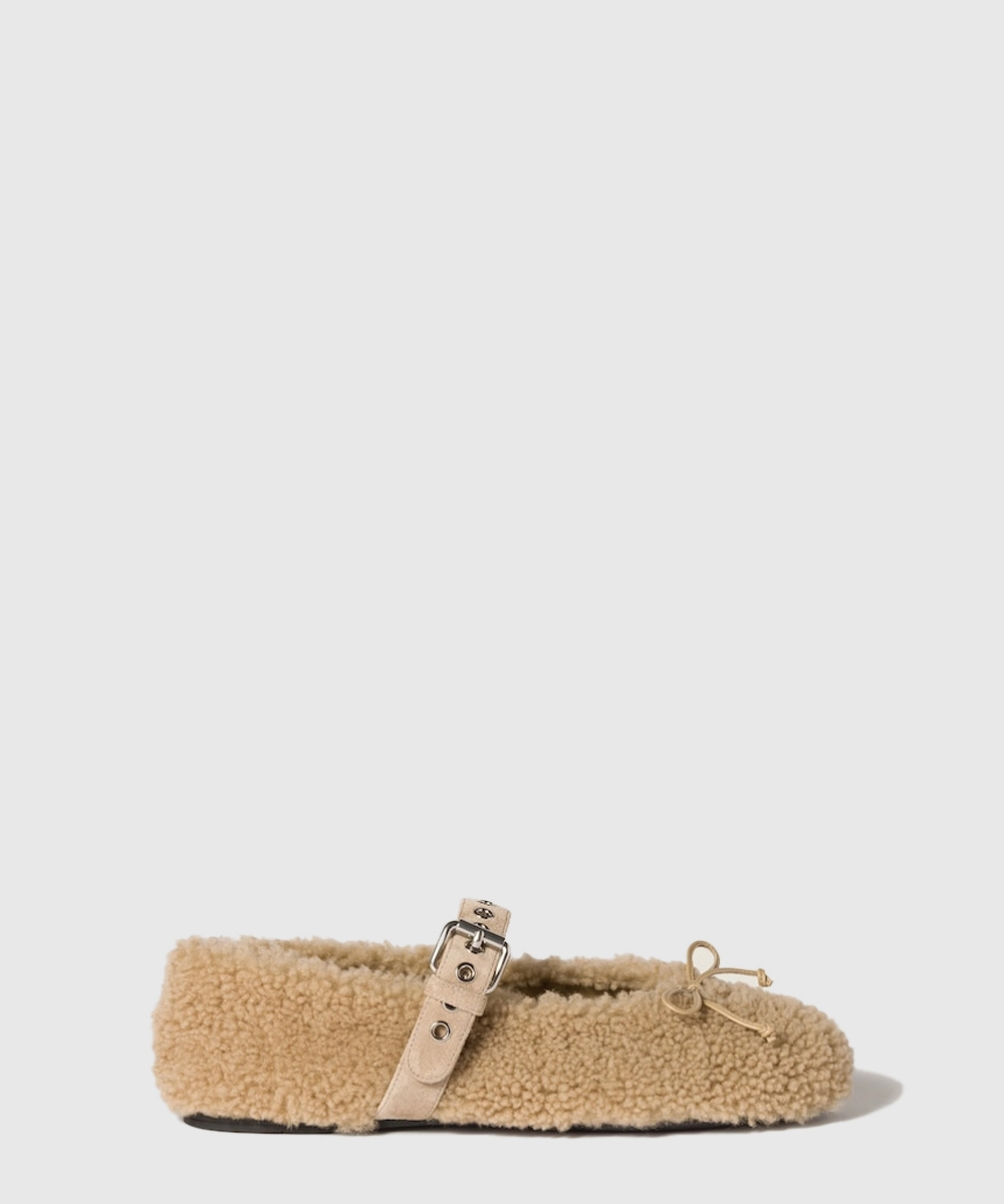 미우미우 시어링 퍼 버클 스트랩 발레리나 슈즈 데저트 베이지 5F272E